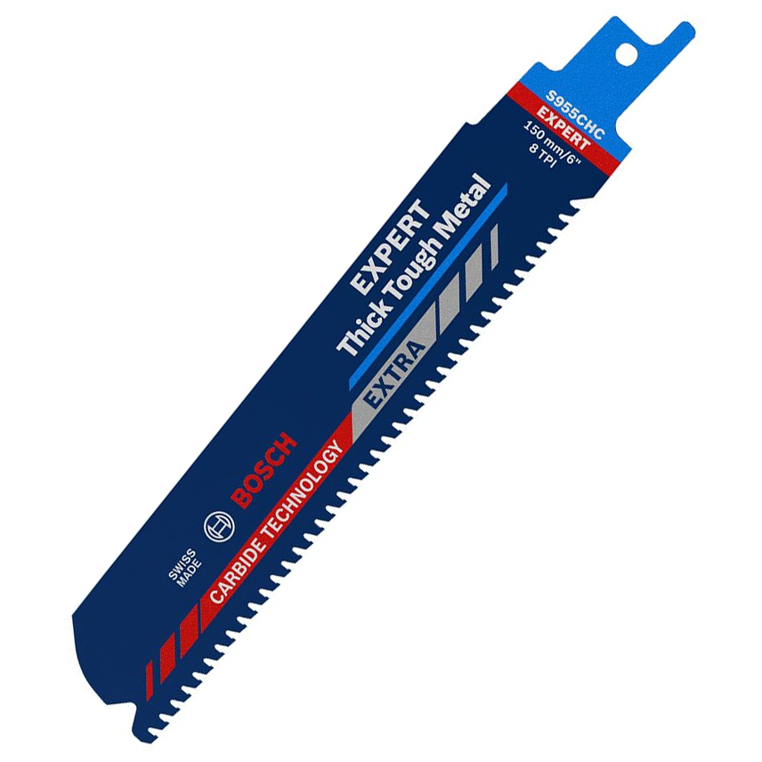 The Bosch Expert S 955 CHC Thick Tough Metal Reciprocating Saw Blade features a wide body for precise, straight cuts. This precise blade cuts straight through material, following your intended line and desired angle. Extra coating makes carbide tougher. Teeth coated with unique Bosch formula to last even longer than normal extremely tough Carbide blades! The thick gauge blade offers extra robustness and stability. It stays true to your intended cut, to allow accurate work during heavy applications.